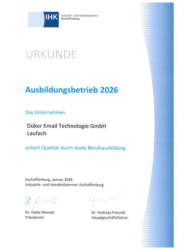 Senden Sie uns Ihre Bewerbung direkt per E-Mail an personal@dueker-emailtechnologie.de – und vergessen Sie dabei bitte nicht, den gewünschten Tätigkeitsbereich anzugeben und aussagekräftige Unterlagen anzuhängen. Wir freuen uns auf Ihre Bewerbung!